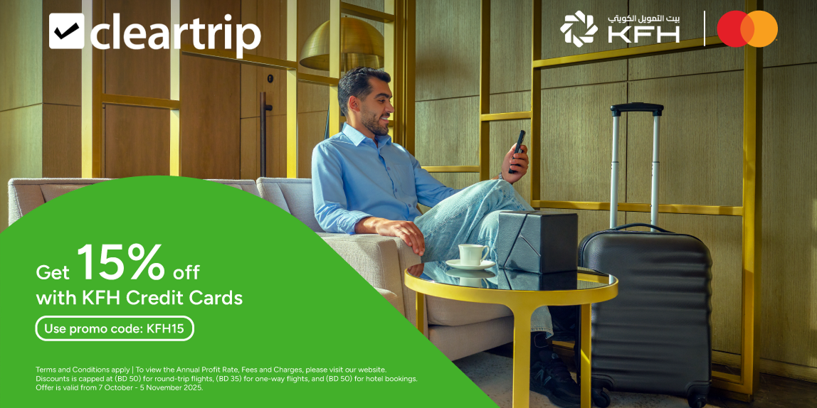 Experience the privilege of smart travel with KFH and Cleartrip. As a valued KFH Credit cardholder, you get 15% off up to 50 BHD per booking when you book your flights or holidays through Cleartrip. Make your journeys smoother, smarter, and more rewarding --- exclusively with your KFH Credit Card.